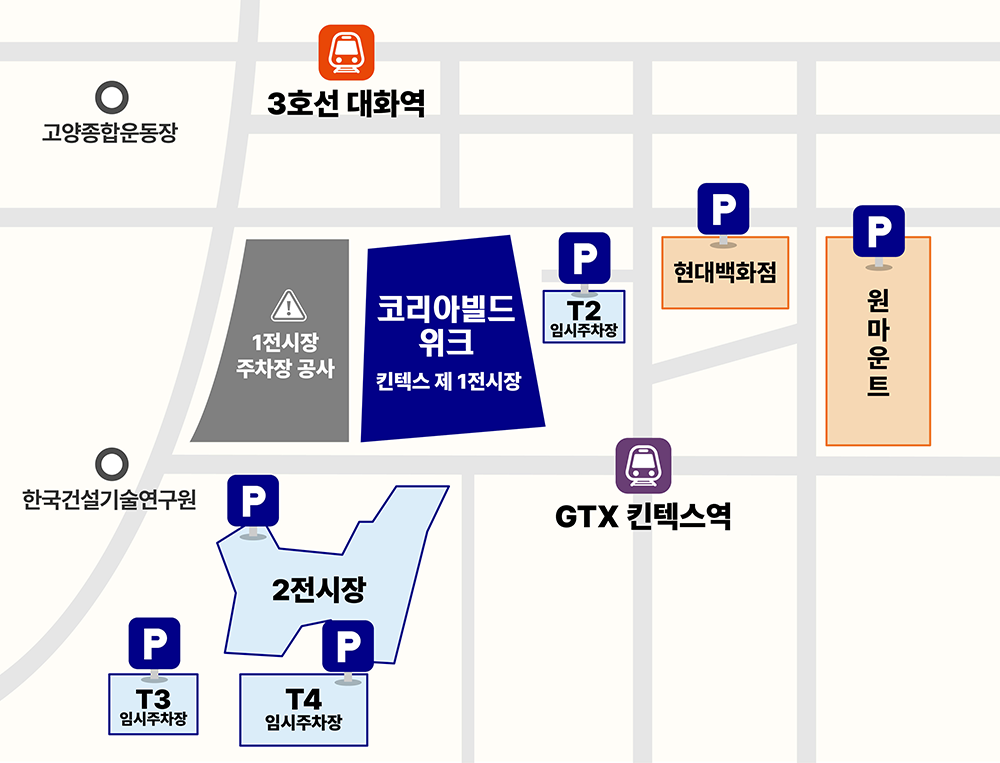 현재 킨텍스 3전시장 건립 공사로 인해 킨텍스 1전시장 주차장 이용이 중단되었습니다.